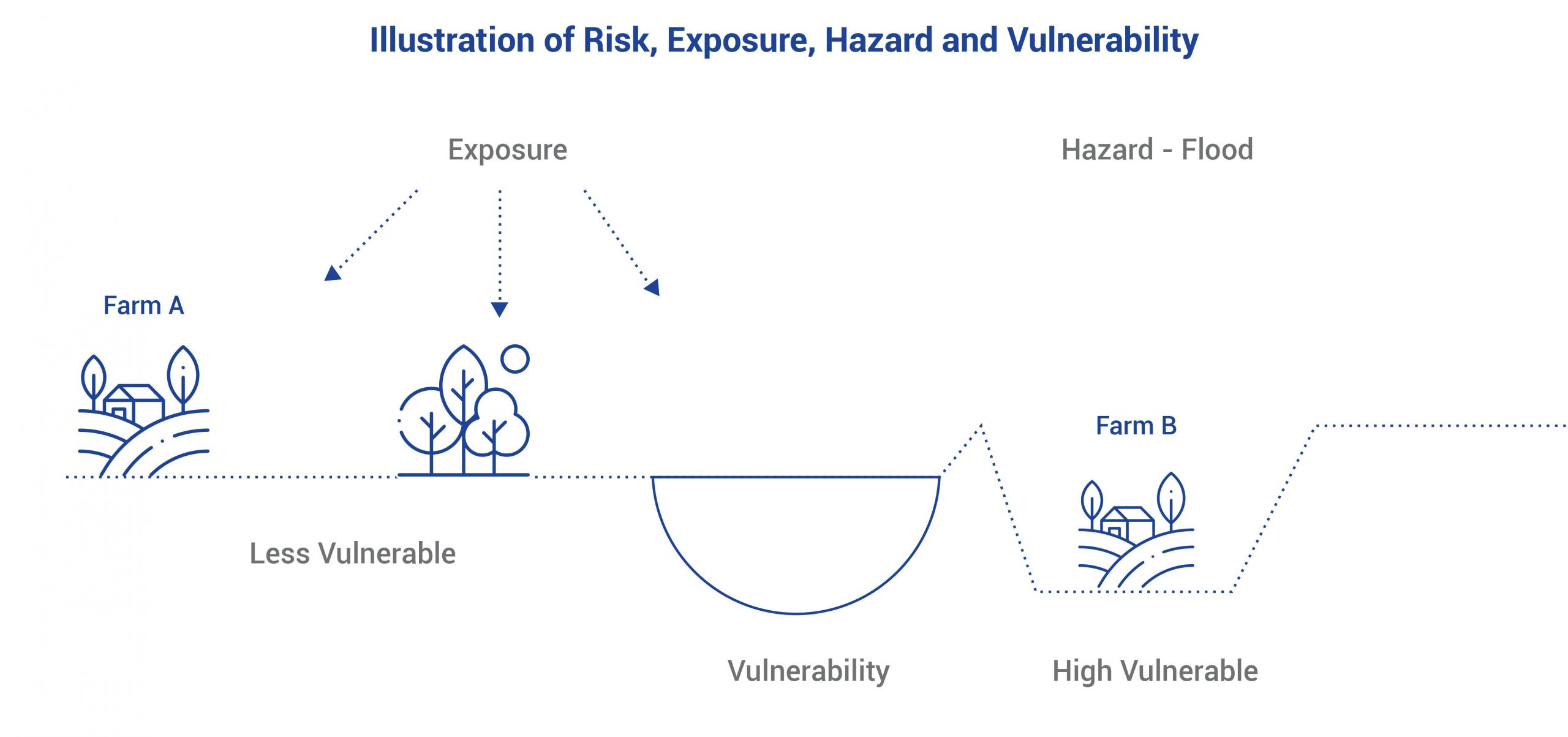 In the image, Farm A is farther from the river, has lower elevation and natural protection (e.g., trees), and therefore lower vulnerability to flooding. Meanwhile, Farm B, closer to the river, has a higher elevation, lacks natural protection, and hence has a higher vulnerability to flooding. Farms with higher exposure and vulnerability are at higher risk and typically have higher crop insurance premiums to compensate for the increased risk. Based on the evaluation of crop type, location, cultivation practices, historical data, and more, underwriters determine the level of risk associated with the insured crop and set appropriate premium rates. Underwriting is crucial for ensuring that insurance premiums reflect the actual risk involved and that the insurer can adequately cover potential losses. Farmers can pay a relatively small premium to receive substantial compensation in the event of unforeseen damages.